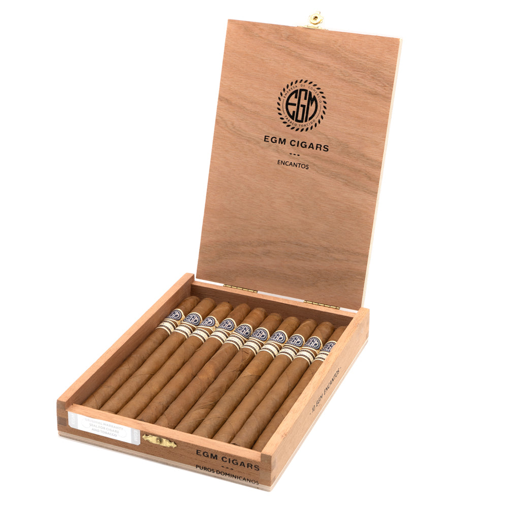The Encantos combine elegant proportions with refined craftsmanship. The long slender format allows a slow, measured burn and gives the aromatic tobaccos room to unfold. Light spice and cedar notes open the experience, giving way to cream, subtle sweetness, and soft wood tones as the cigar progresses. This blend reflects the purity and sophistication of Dominican puros from the Cibao Valley. Each box of 10 cigars is presented in a clean and understated package that aligns with EGM’s modern luxury aesthetic. The Encantos has been praised by connoisseurs and acclaimed by Cigar Journal International for its balance, finesse, and distinctive character.