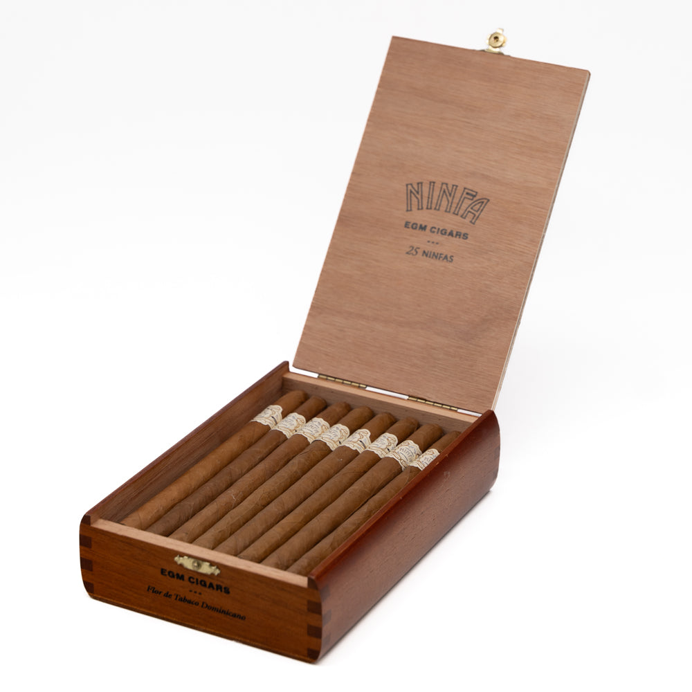 Boxed in varnished wooden boxes in a 3-4-3 configuration for 10-count boxes and 8-9-8 configuration for 25-count boxes, these cigars are a true collector’s treasure. Presented in beautifully finished boxes of 10 and 25 cigars, the Ninfas combines traditional elegance with modern craftsmanship, making it an ideal choice for collectors and connoisseurs who appreciate long, graceful smokes.
