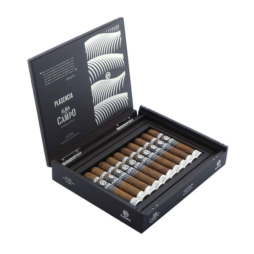Presented in refined boxes of 10 cigars, each Plasencia Alma del Campo Tribu is adorned with elegant white-and-gold banding. The box features a removable lid that doubles as an ashtray, combining functionality with modern sophistication.