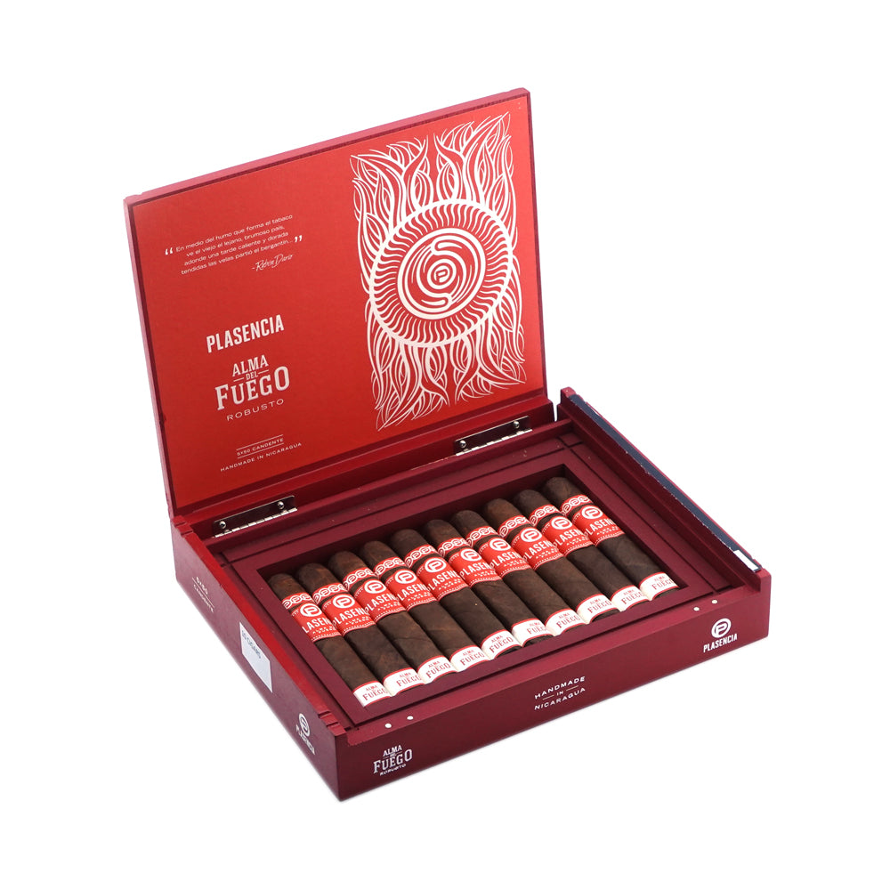 Presented in elegant boxes of 10 cigars, each Plasencia Alma del Fuego Candente is box pressed and dressed in a rich reddish-brown wrapper with bold red-and-white triple banding. The lid of the box doubles as a stylish ashtray, reflecting the brand’s signature design.