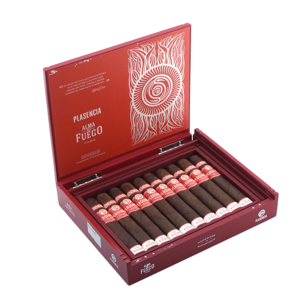 Presented in elegant boxes of 10 cigars, each Plasencia Alma del Fuego Concepción is box pressed with an oily reddish-brown wrapper and bold red-and-white triple banding. The box lid doubles as a stylish ashtray, merging practical design with refined aesthetics.