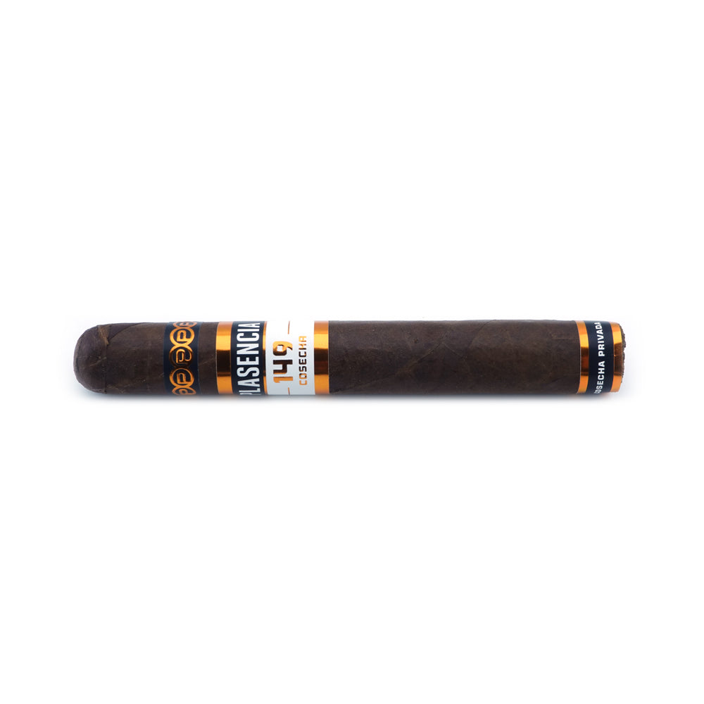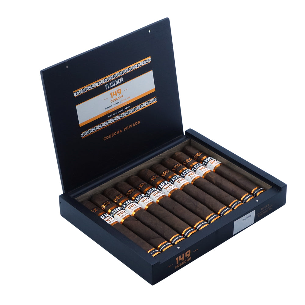 Presented in elegant boxes of 10 cigars, Plasencia Cosecha 149 Azacualpa features a deep, textured wrapper leaf and a clean double cap. The cigar is finished with distinctive copper, black, and white banding, highlighting its refined character and the Plasencia tradition of quality craftsmanship.
