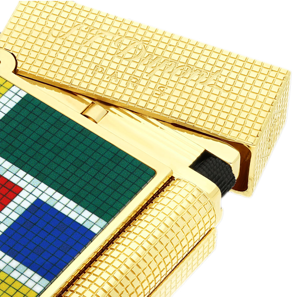 Material: Brass with gold finish and multicolored lacquer mosaic (guilloché with transparent lacquer details)